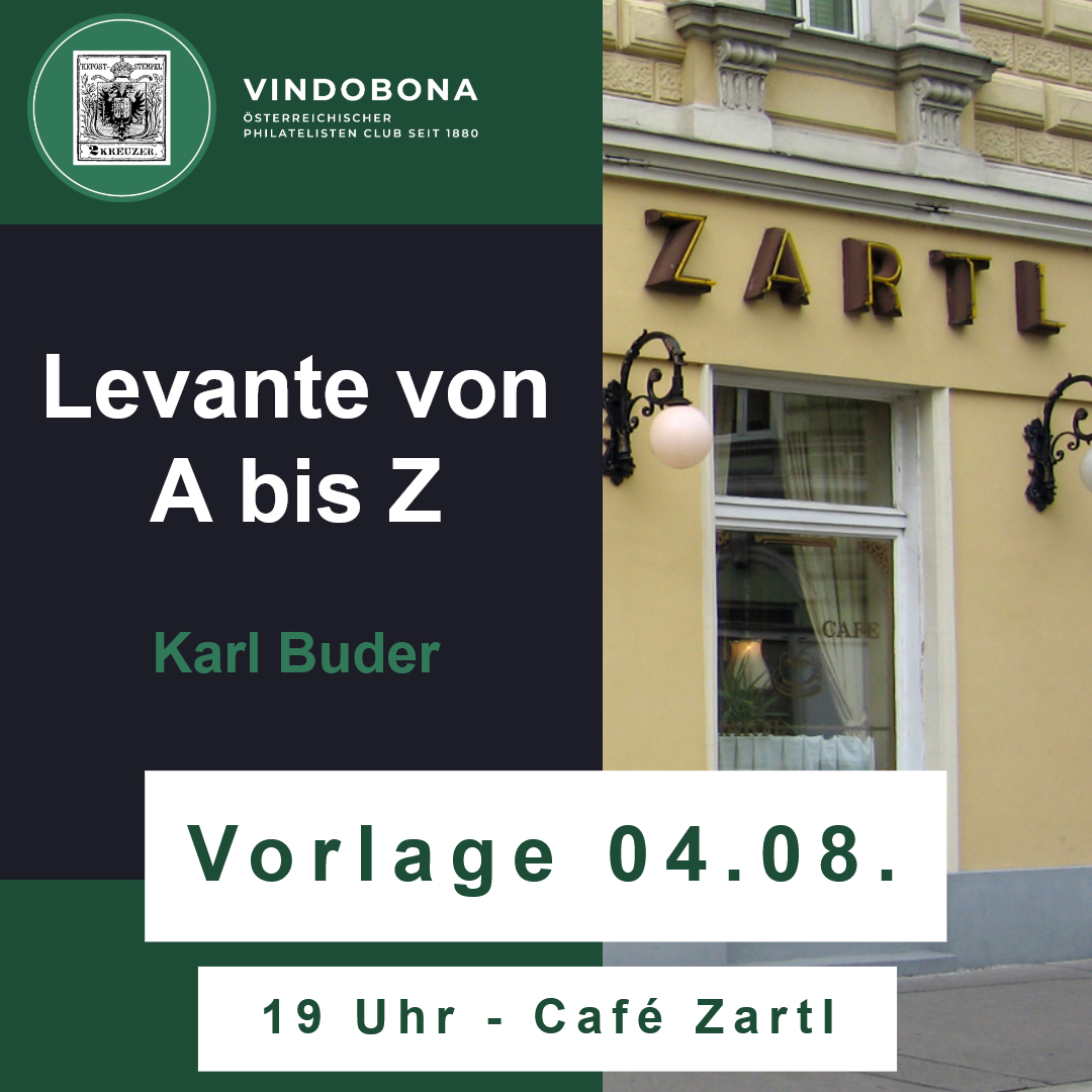 Levante von A bis Z Karl Buder + Add to Google Calendar + iCal export Date 04 Aug 2025 Time 19:00 Location Café Zartl Rasumofskygasse 7, 1030 Wien Category Kleine Vorlagen Organizer Vindobona Österreichischer Philatelisten Club Share this event