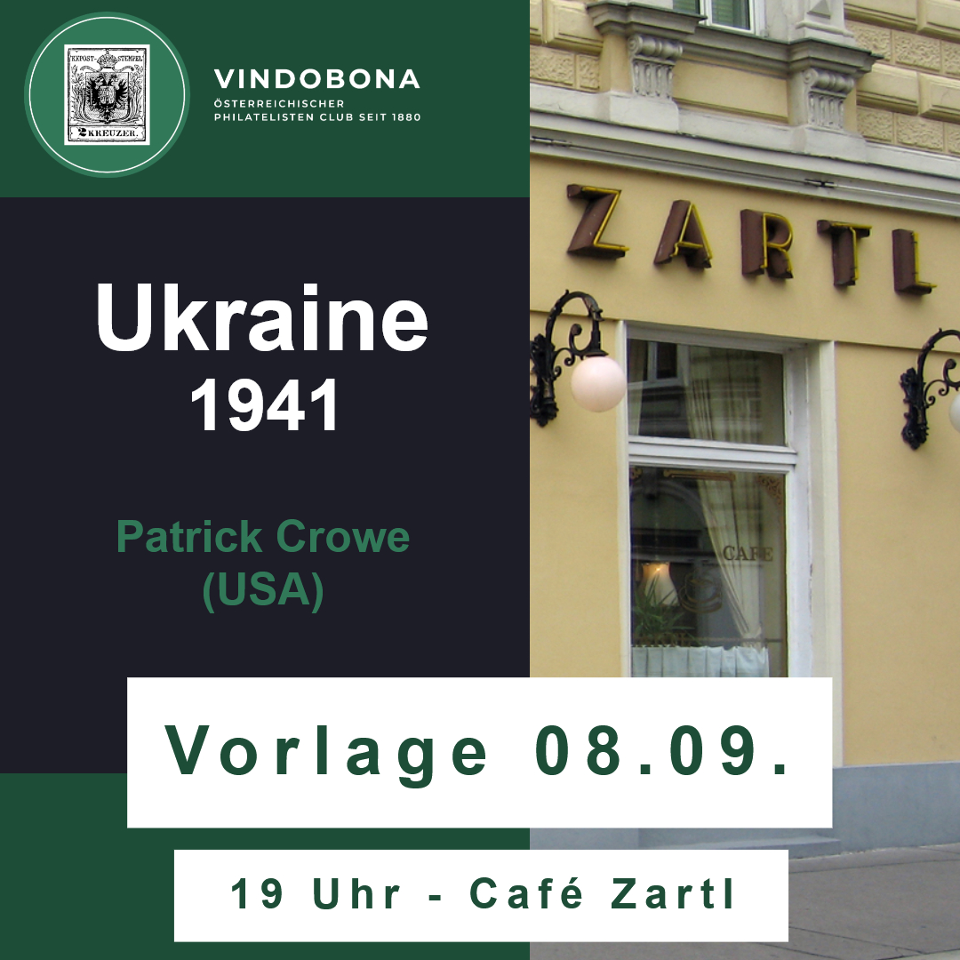 Ukraine 1941 Patrick Crowe (USA) + Add to Google Calendar + iCal export Date 08 Sep 2025 Time 19:00 Location Café Zartl Rasumofskygasse 7, 1030 Wien Category Kleine Vorlagen Organizer Vindobona Österreichischer Philatelisten Club Share this event