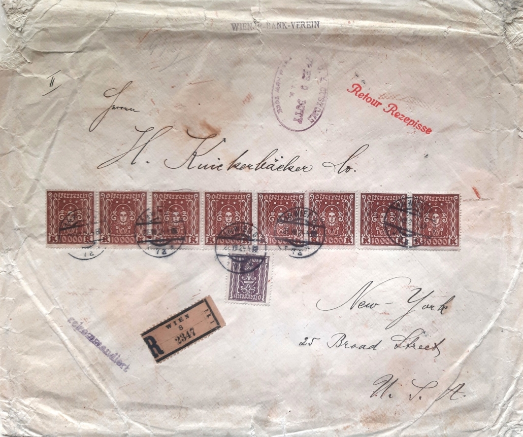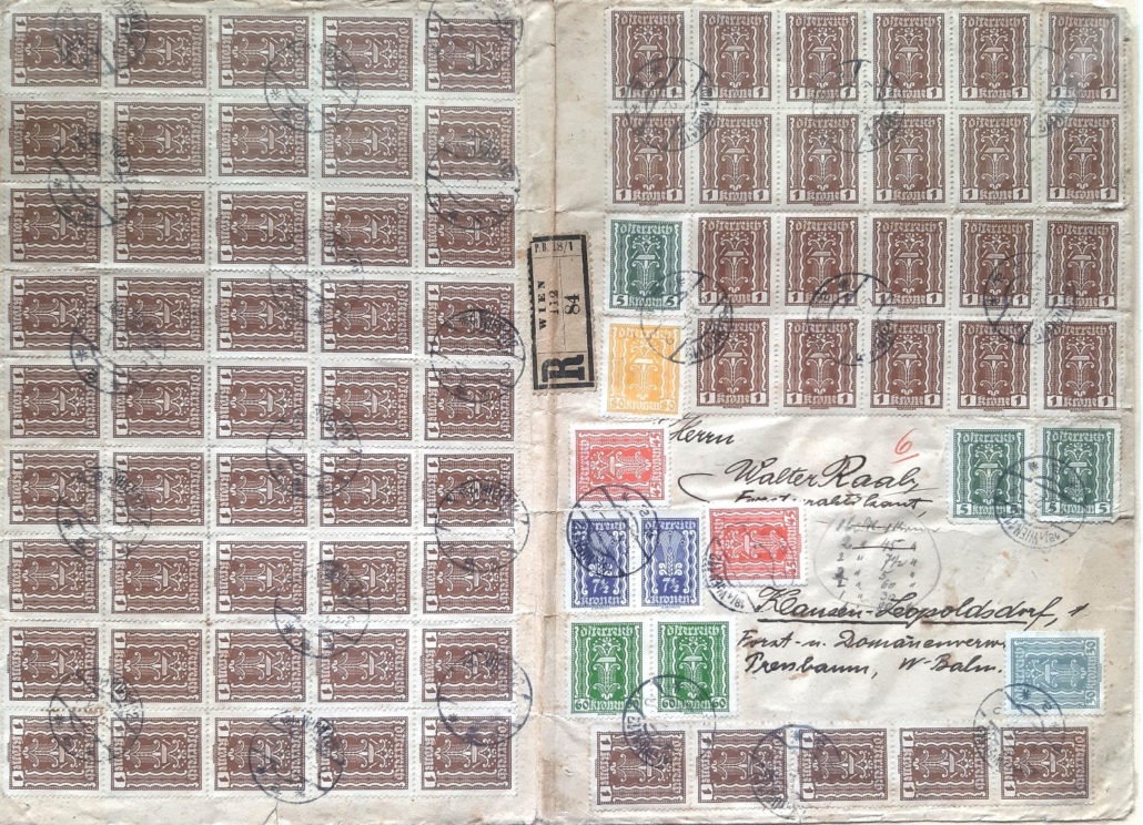 Eine Halbierung der 6-Kreuzer-Ausgabe 1850 auf Brief, mehrere Ersttage vom 1. Juni 1850, eine Karte mit Ersttag der Heller/Kronen-Währung am 1. Jänner 1900 oder eine außergewöhnliche Frankatur von acht Stück 10.000-Kronen-Marken – ein Unikat – auf einem Inflationsbrief nach New York. Insgesamt wanderten etwa 70 Sammlungsblätter, reich gespickt mit postgeschichtlichen Seltenheiten, durch die Reihen und sorgten für begeisterten Zuspruch.